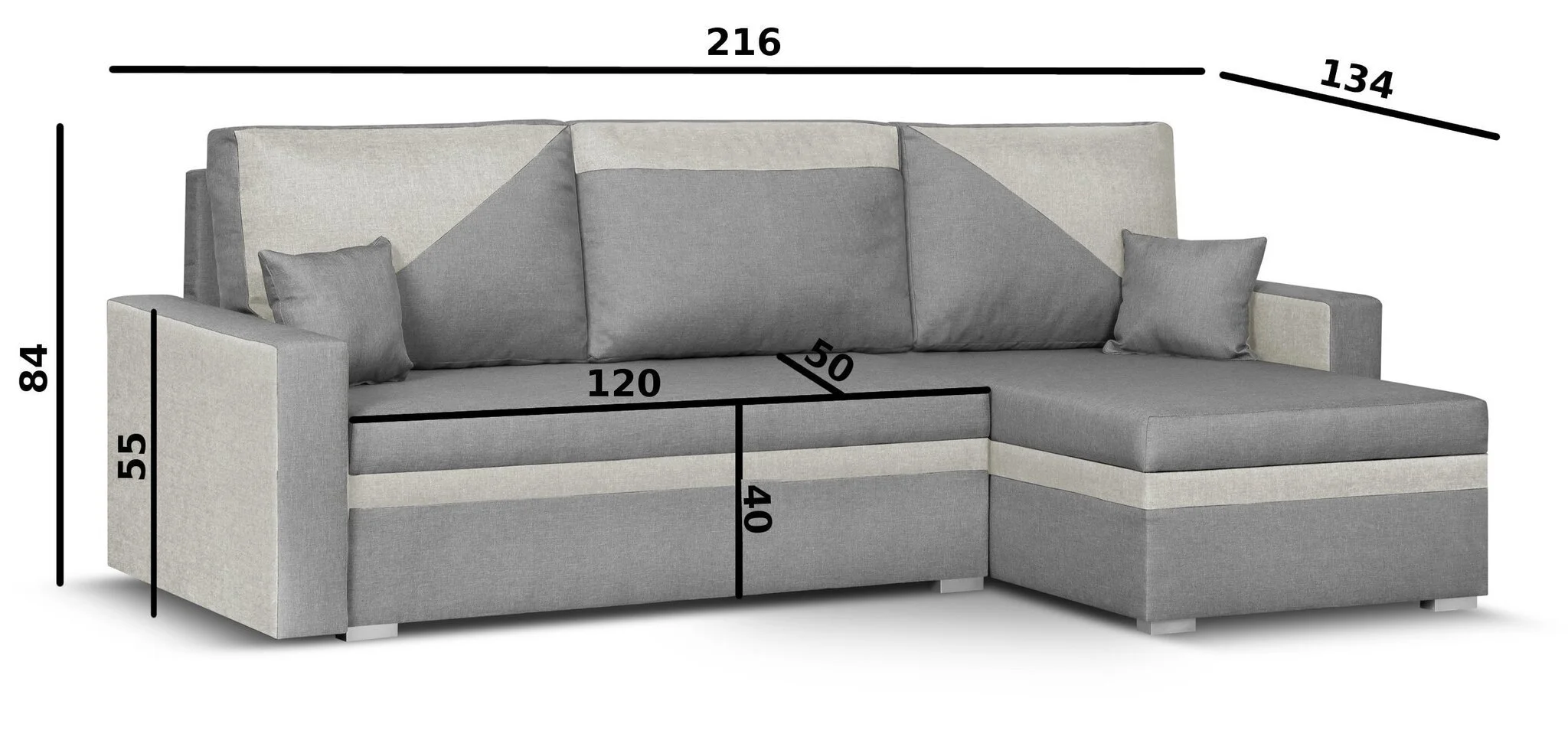 - Vuodekulmasohva, vuoteen koko – 190 cm, leveys – 120 cm;