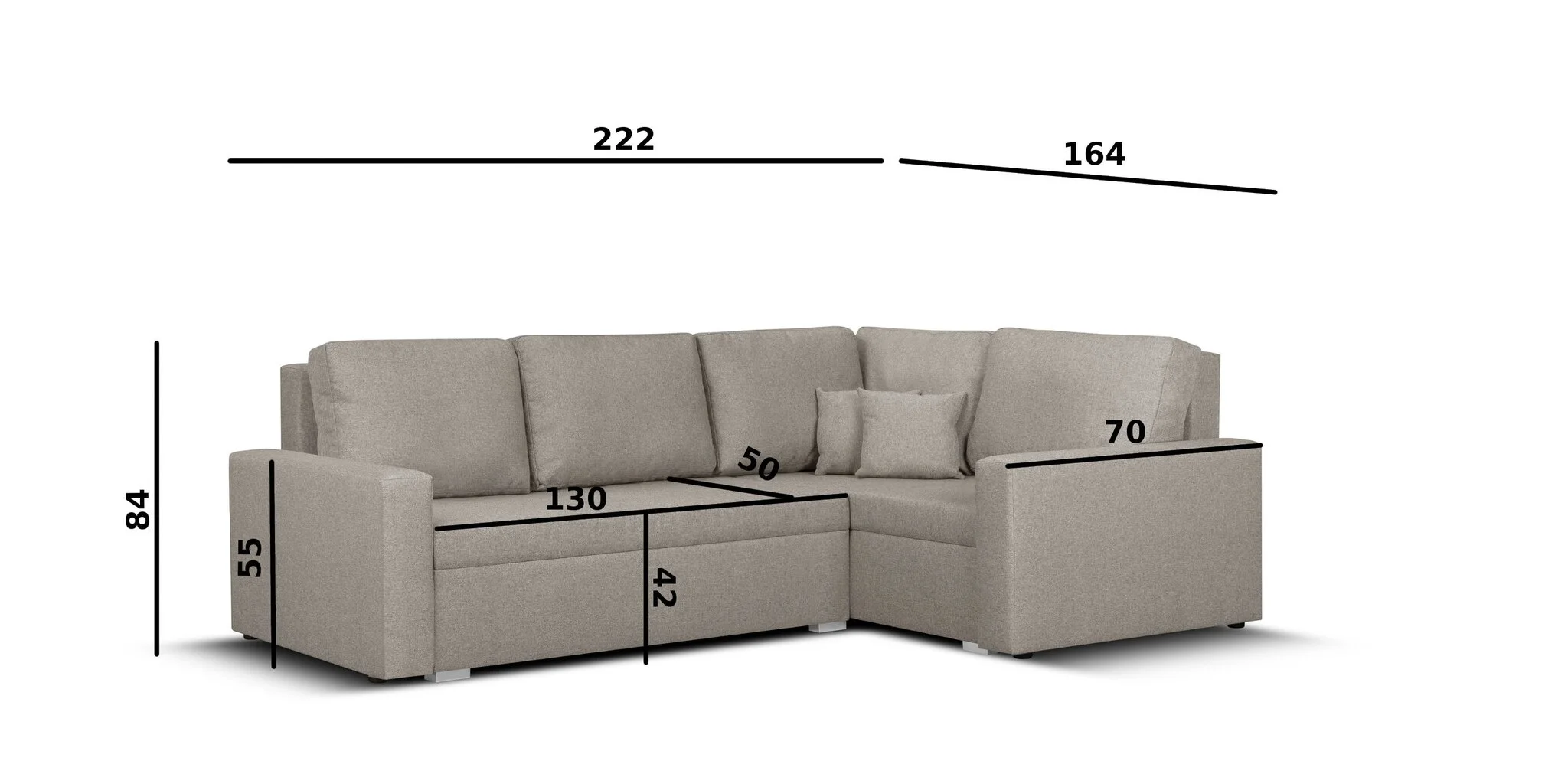 - Huonekalun ulkomitat: pituus – 222 cm, syvyys – 164 cm, korkeus – 84 cm