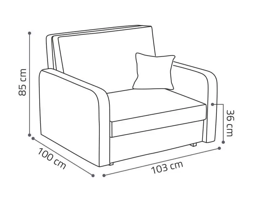 - Vuodesohvan koko: pituus – 103 cm, syvyys – 100 cm, korkeus – 85 cm;