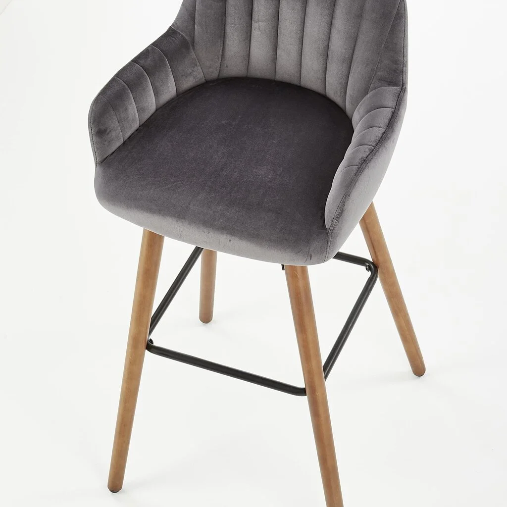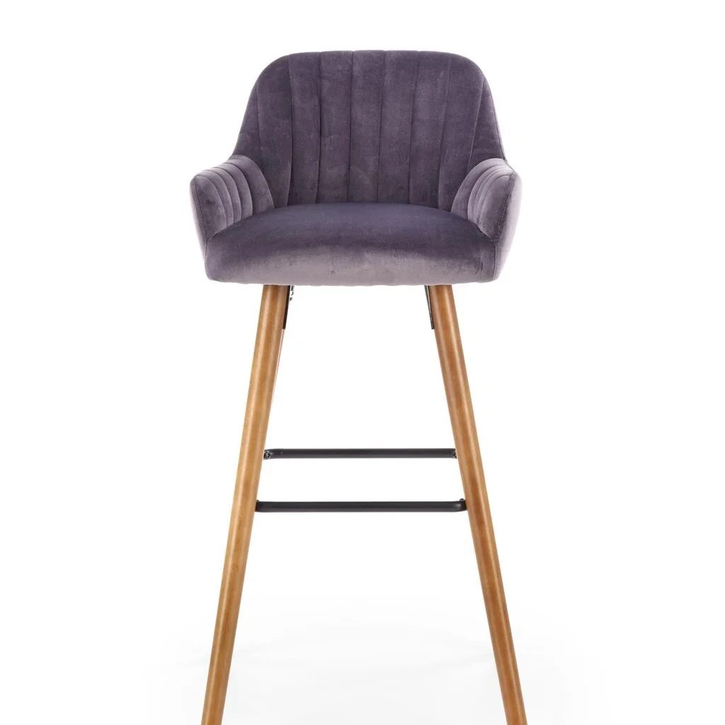 Moderni ja tyylikäs baarijakkara mukavalla istuinalueella ja mukavalla selkänojalla, päällystetty pehmeällä ja herkällä velourilla, joka sopii täydellisesti tammijalkojen ja mustien jalkojen kanssa – tästä baarituolista tulee tyylikäs ja kodikas aksentti kotiisi!