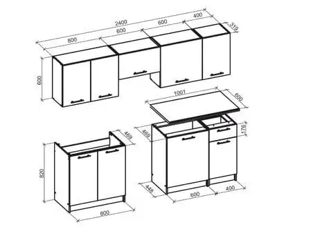 – leveys: 240 cm, syvyys: alemmat kaapit 45 cm (ilman työpintaa) työpinta 60 cm, ylemmät kaapit 30 cm.