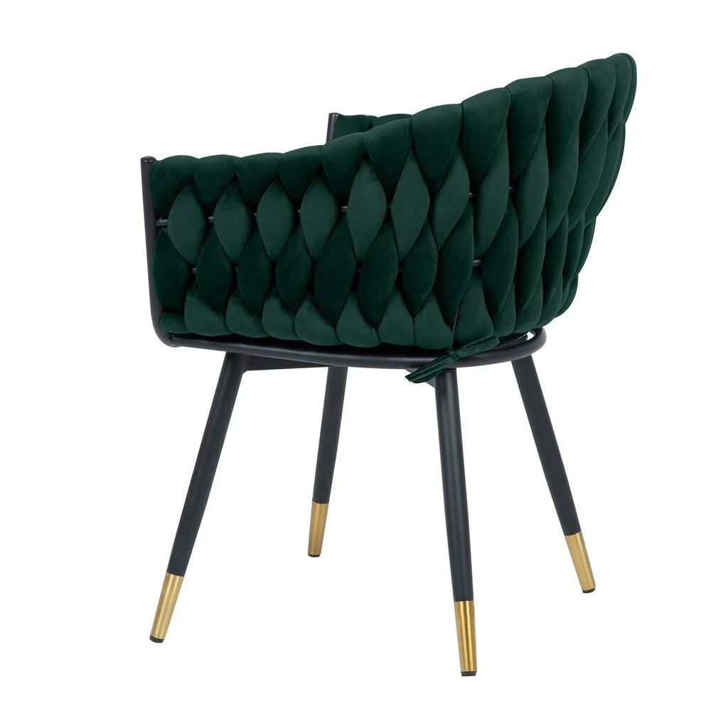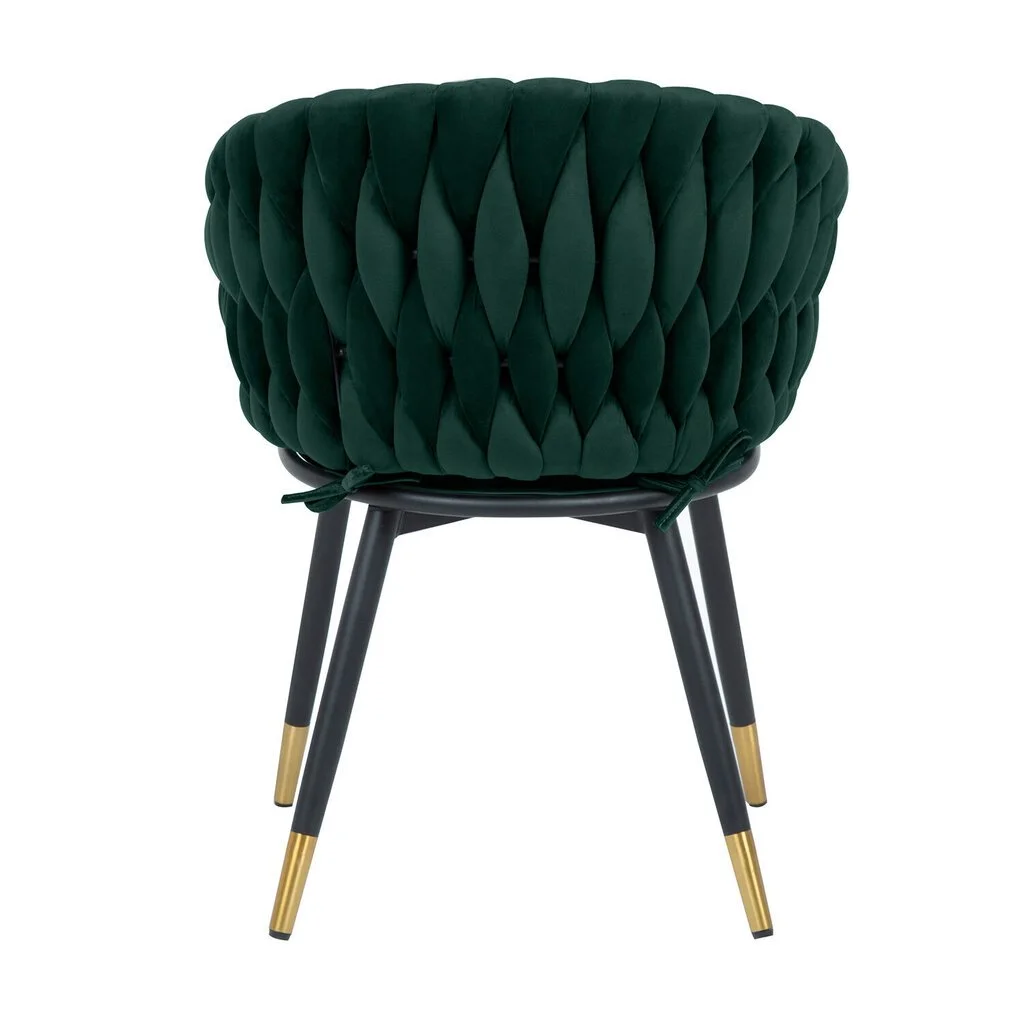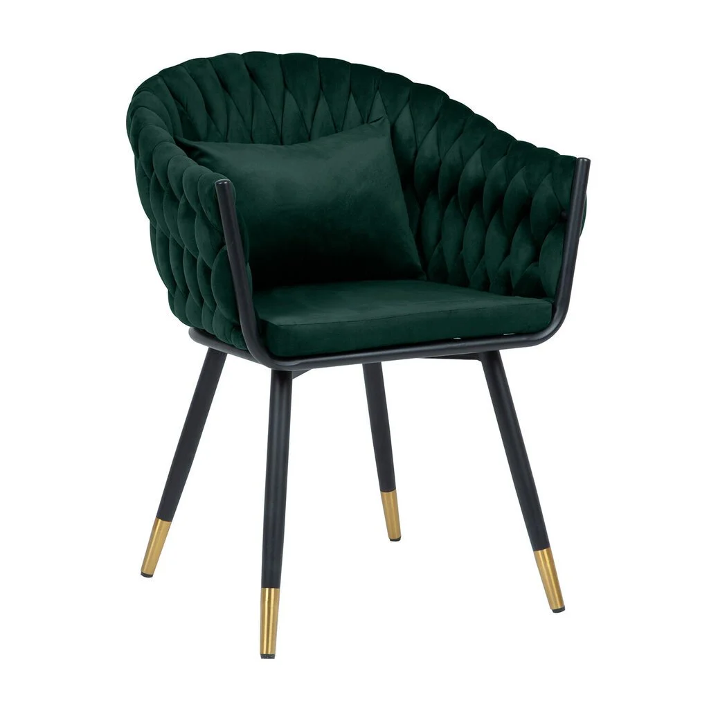 Tuoli FLORA tummanvihreä sametti. Tuolin istuin ja selkänoja on verhoiltu ja päällystetty samettikankaalla. Selkänojan tuuhea aaltomainen pehmuste on saatu aikaan kudontatekniikalla. Pieni lisätyyny tuolin selkänojassa takaa paremman istumismukavuuden. Tyynyn mitat 38x28cm. Kannen materiaali: 100 % polyesteriä, 260 g/m². Martindale 25 000. Tuolin jalat ja runko on valmistettu metallista ja viimeistelty mustalla jauhemaalilla, jalkojen alapäät ovat kultaiset. Tuolin kokonaismitat ovat 61x63xH83cm, istuimen leveys 45cm, istuimen syvyys 46cm ja istuimen korkeus 50cm. Selkänojan korkeus 38cm. Painoraja 120kg.