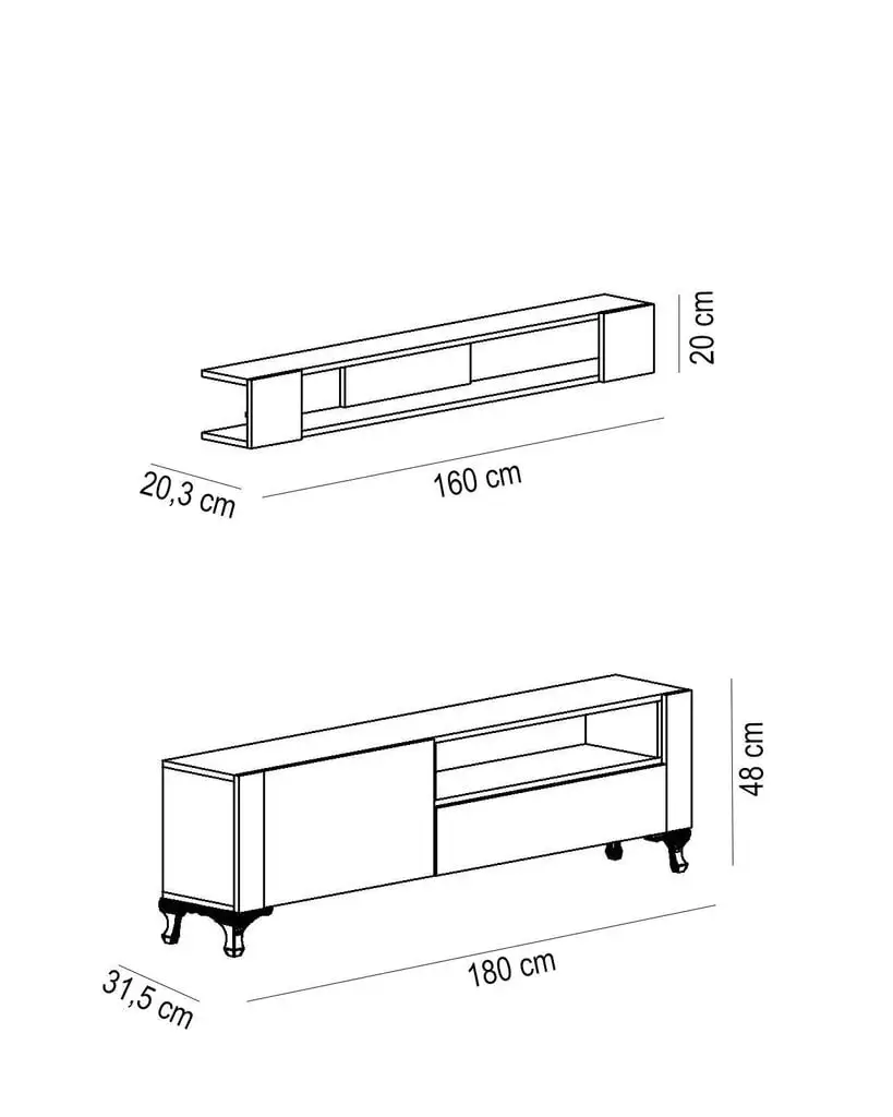 • TV-pöydän mitat: pituus – 180 cm, korkeus – 48 cm, syvyys – 31,5 cm;
