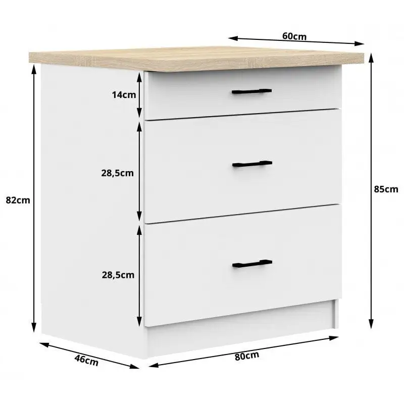 Kompaktit ja käytännölliset huonekalut on helppo nostaa ja siirtää. Joskus se voidaan koota, mikä vapauttaa vielä enemmän tilaa. Tästä syystä on mahdollista luoda minimalistinen ja ergonominen ympäristö, jossa on tilaa muille suunnitteluratkaisuille ja mukavalle käsittelylle. Toisin sanoen Keittiökaappi NORE Oliwia S80, 3 laatikkoa, valkoinen sopii helposti luotavaan ympäristöön eikä häiritse viime hetken päätöksiä.
