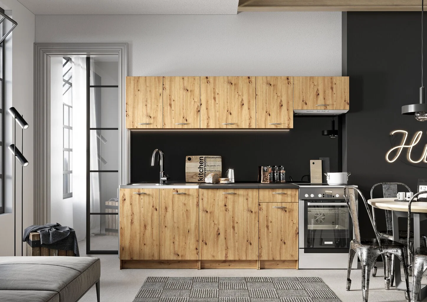 Levyn yläkerros peitetään usein erityisellä kalvolla, joka varmistaa huonekalun lujuuden. Viimeisimpien tuotantoteknologioiden avulla nämä laatat voivat olla kosteudenkestäviä, minkä vuoksi nämä materiaalit eroavat monipuolisuudestaan ja sopivat mihin tahansa huoneeseen. Keittiönkaappisarja Stolkar Mela 1.8/2.4 työtasolla, ruskea löytää varmasti paikan kodistasi!