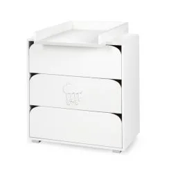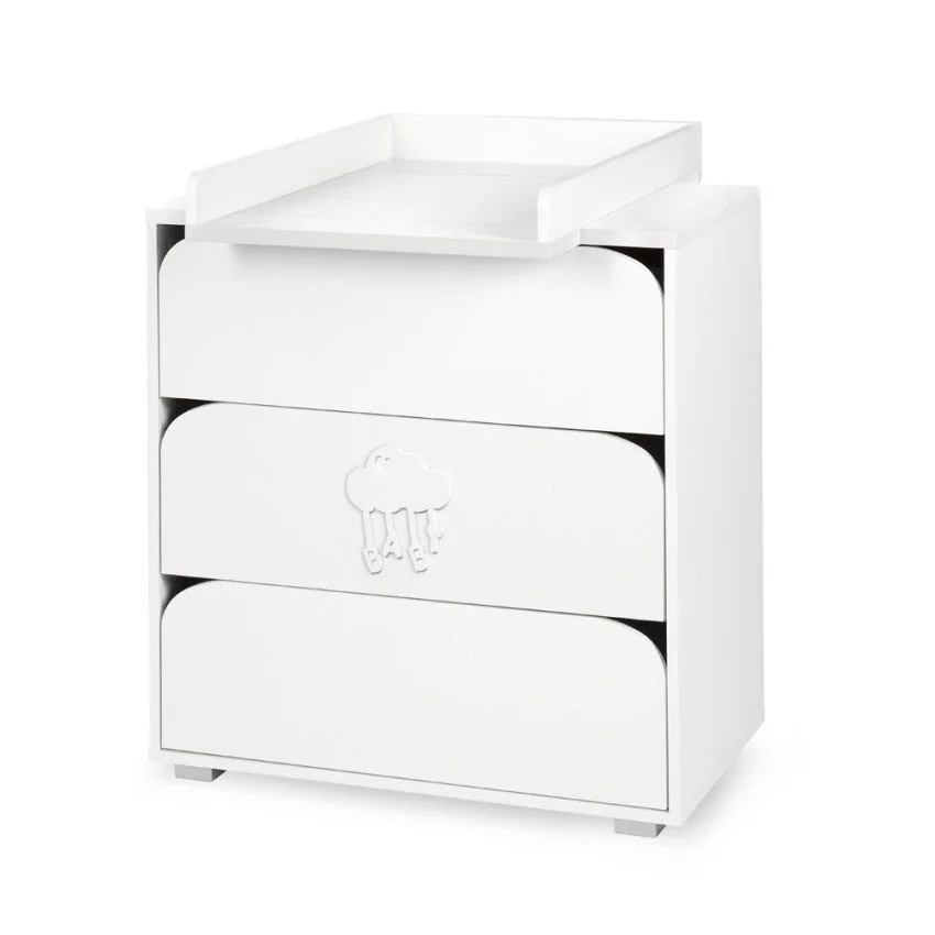 Levyn yläkerros peitetään usein erityisellä kalvolla, joka varmistaa huonekalun lujuuden. Viimeisimpien tuotantoteknologioiden avulla nämä laatat voivat olla kosteudenkestäviä, minkä vuoksi nämä materiaalit eroavat monipuolisuudestaan ja sopivat mihin tahansa huoneeseen. Lipasto hoitopöydällä Klupś Nel Cloud, valkoinen löytää varmasti paikan kodistasi!