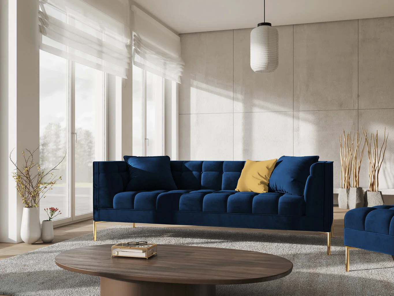 Minimalismia ja ylellisyyttä yhdessä? Kyllä Nämä ovat Karoo-kokoelman huonekalut. Ne erottuvat yksinkertaisuudesta ja tyylikkäistä yksityiskohdista – kultaisista jaloista ja tikatusta istuimesta.