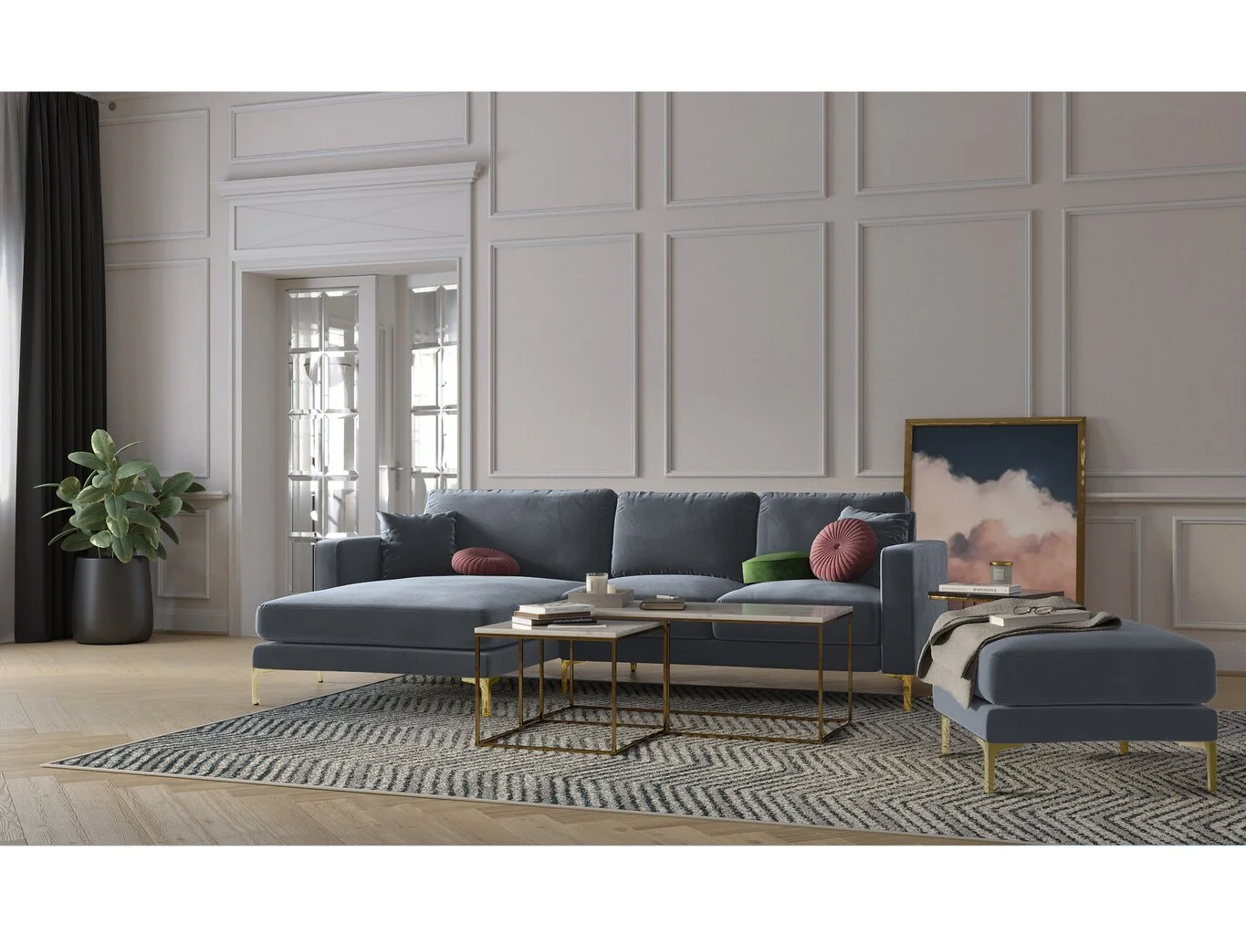- Verhoilumateriaali: synteettinen samettikangas, joka on poikkeuksellisen kestävä ja jossa on hienovarainen kiilto; Erittäin pehmeä sohva on miellyttävä koskettaa.