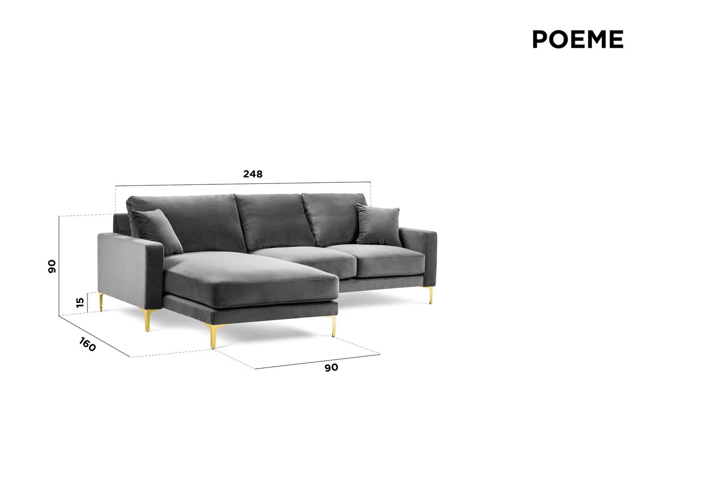 - Pehmeän kulmasohvan ulkomitat: pituus – 248 cm, syvyys – 160 cm, korkeus – 90 cm