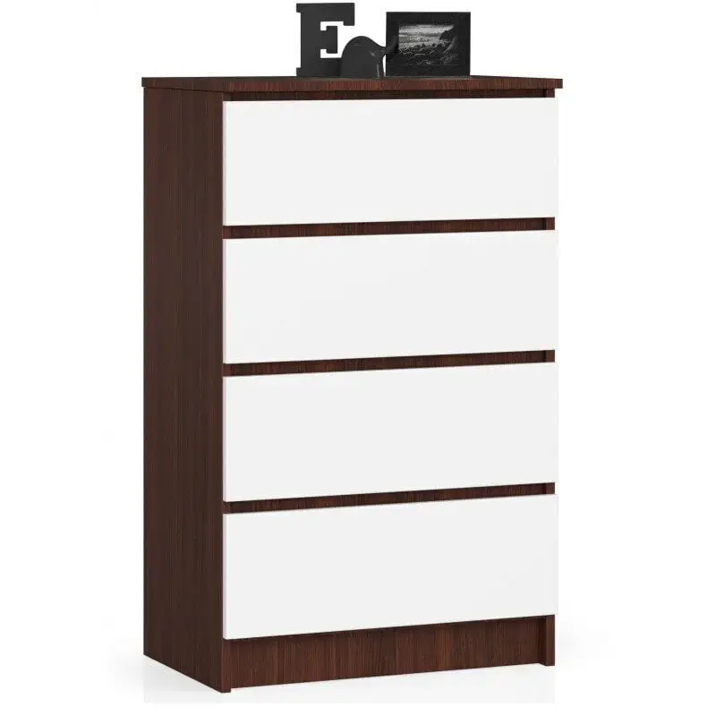 Levyn yläkerros peitetään usein erityisellä kalvolla, joka varmistaa huonekalun lujuuden. Viimeisimpien tuotantoteknologioiden avulla nämä laatat voivat olla kosteudenkestäviä, minkä vuoksi nämä materiaalit eroavat monipuolisuudestaan ja sopivat mihin tahansa huoneeseen. Lipasto NORE K60 4 laatikolla, ruskea/valkoinen löytää varmasti paikan kodistasi!