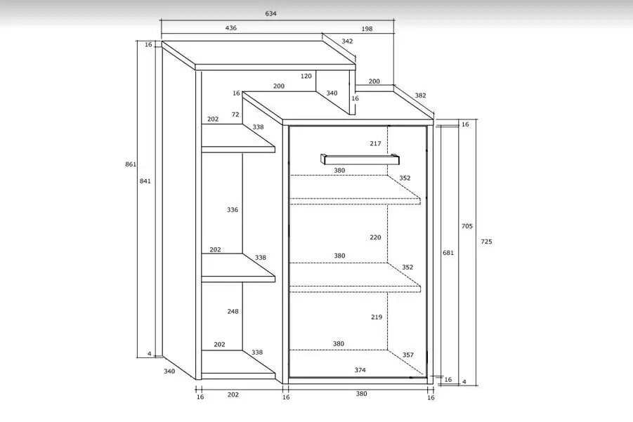 - Mitat: syvyys 38 cm, leveys 64 cm, korkeus 86 cm.