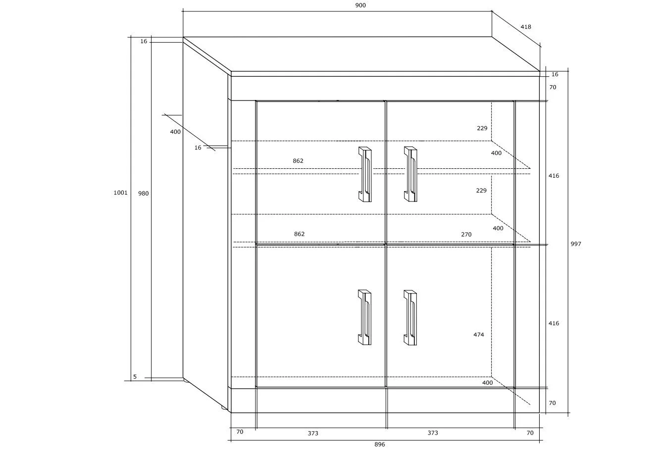 - Mitat: syvyys 44 cm, leveys 90 cm, korkeus 100 cm.
