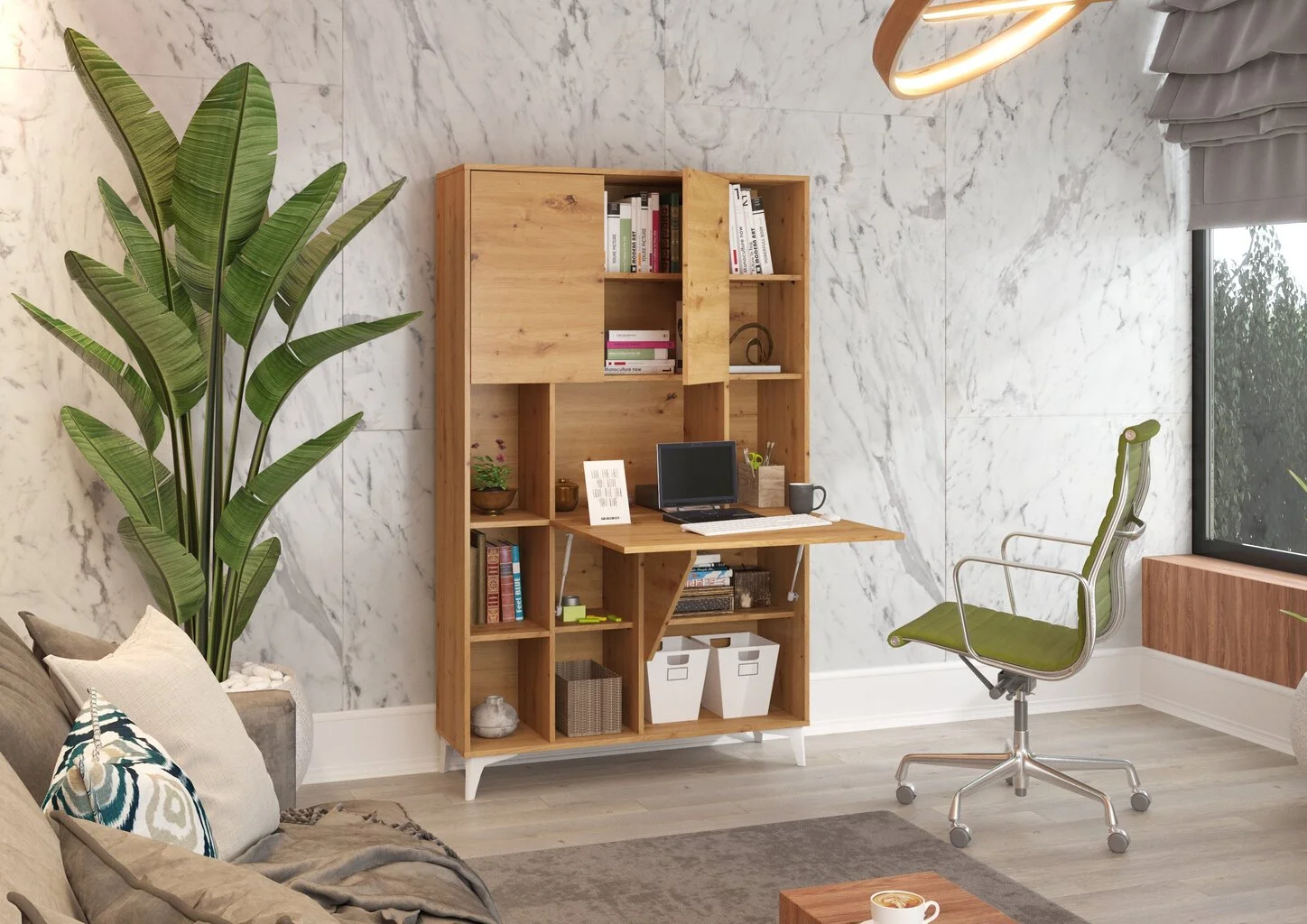 • Moderni taitettava monitoimihyllykaappi kahdella ovella ja integroidulla pöydällä.