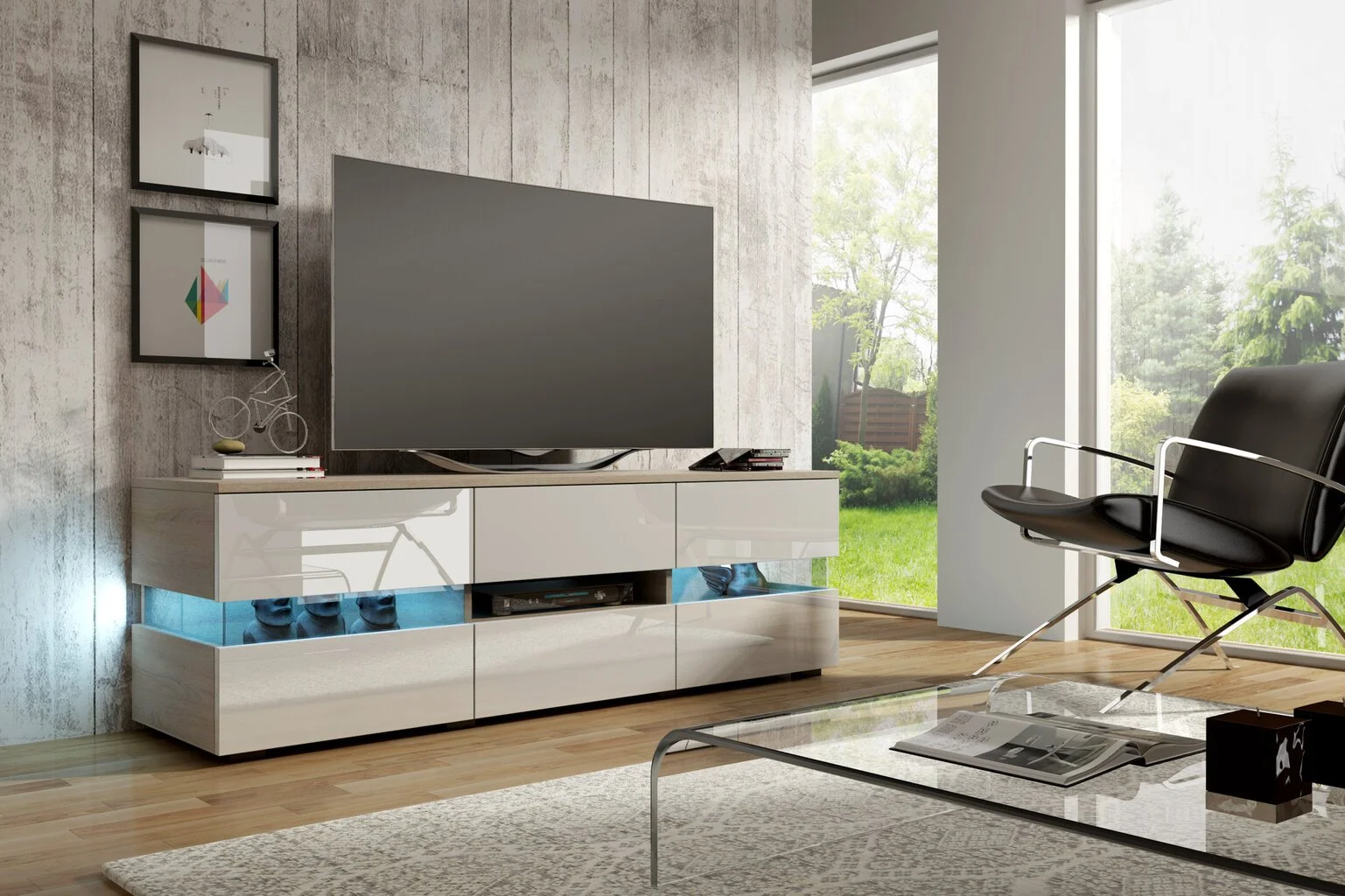 Modernilla designilla varustettu TV-pöytä Inter lisää modernia olohuoneeseesi. Minimalistisen muotoilun ja tilavuuden ansiosta tälle pöydälle on mahdollista säilyttää oikein kaukosäätimet, DVD-laitteet tai muut olohuoneen tarvikkeet.