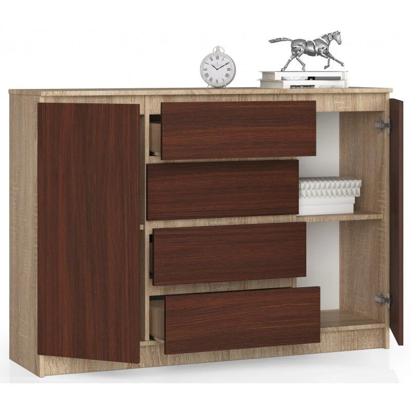 - Tyylikäs senkki on varustettu kahdella ovella sekä neljällä vetolaatikolla;
