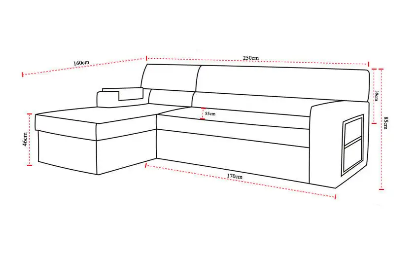 Sohvan mitat: pituus – 250 cm, korkeus – 160 cm, syvyys – 85 cm