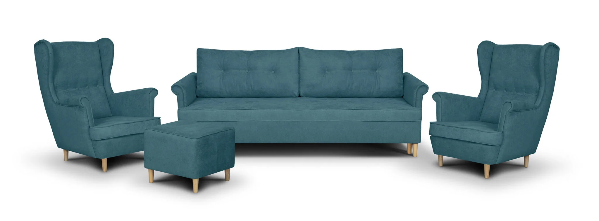 - Setti sisältää: 3-istuttava sohva, 2 nojatuolia ja rahin