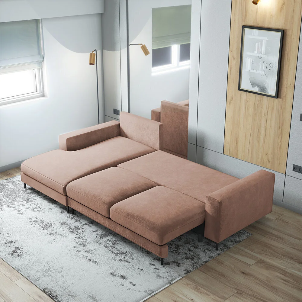 Yksi tämän huonekalun ilmeisimmistä eduista on tilansäästö: niin kauan kuin huonekaluja ei pureta, se vie huomattavasti vähemmän tilaa. Tästä syystä tällä toiminnolla varustetut huonekalut valitsevat useimmiten ne, joiden on laskettava huolellisesti jokainen vapaa tuuma. Pehmeä kulmasohva Selsey Mokpeo, vaaleanruskea sopii erinomaisesti myös suurempiin tiloihin: joten siellä on enemmän tilaa muille yksityiskohdille. Useimmissa tämän tyyppisissä huonekaluissa on liinavaatelaatikko sisällä – näin tavaroiden säilytysongelma ratkeaa taas.
