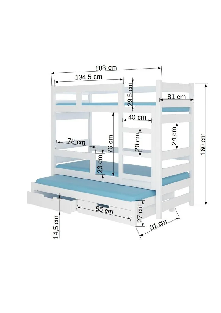 - Sängyn ulkomitat: pituus – 188 cm, leveys – 81 cm, korkeus – 160 cm;
