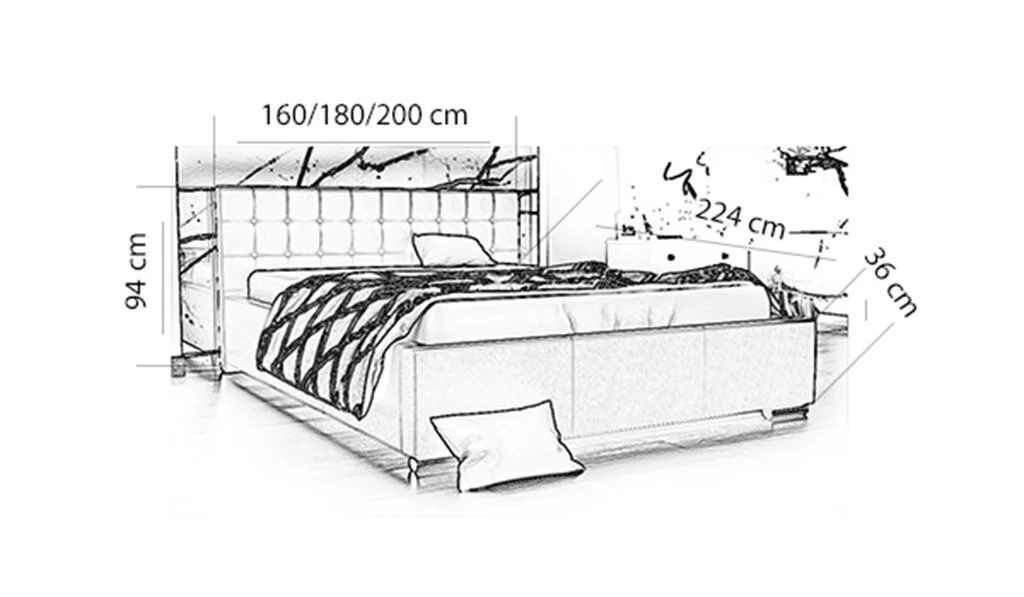 - Sängyn mitat: pituus – 224 cm, korkeus – 94 cm, leveys – 200 cm