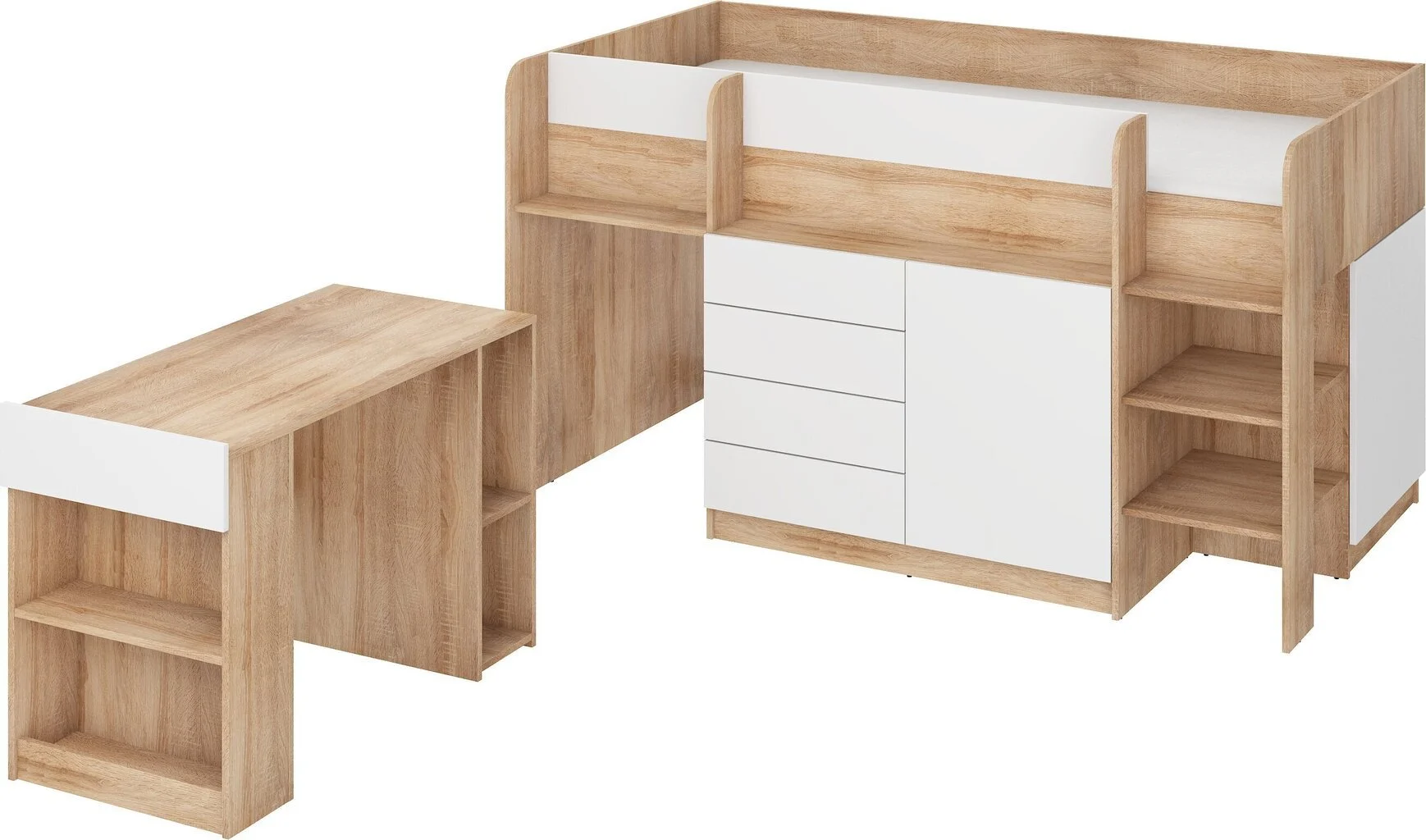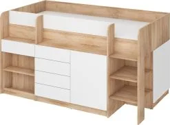 -Tyylikäs lasten sänky kirjoituspöydällä. -Kalusteita täydentävät kaksi ovellista osiota, neljä laatikkoa ja kaksi avohyllyä, jotta kaikki tarvittavat tavarat löytävät sopivan paikan. -Mukava muotoilu on ihanteellinen niille, jotka säästävät tilaa ja haluavat järjestetyn ja siistin sisustuksen.