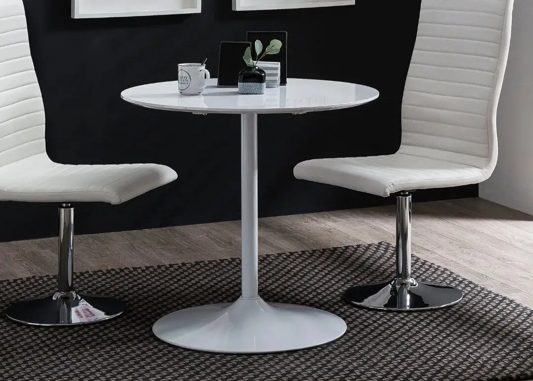 Kaikki nämä modernien huonekalujen ominaisuudet vahvistavat sen tosiasian, että tämän tyylin tuotteet ovat yksinkertaisia ja samalla erittäin yleisiä. Joten ne on helppo sijoittaa kaikenkokoisiin huoneisiin. Ruokapöytä Ø 80 cm pitää niistä, jotka haluavat luoda minimalistisen ja tilavan tilan, jossa on kunnollinen ja raikas luonto.