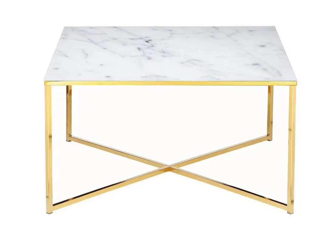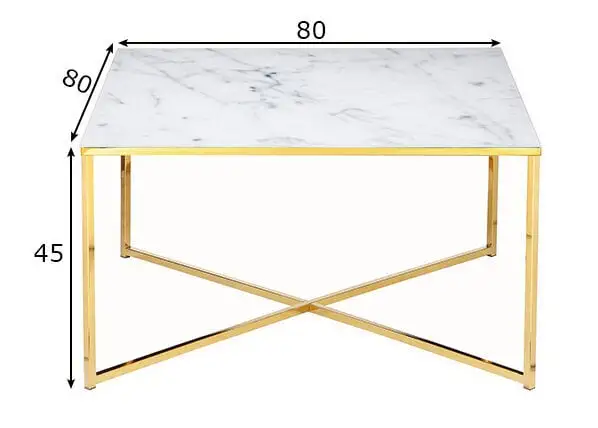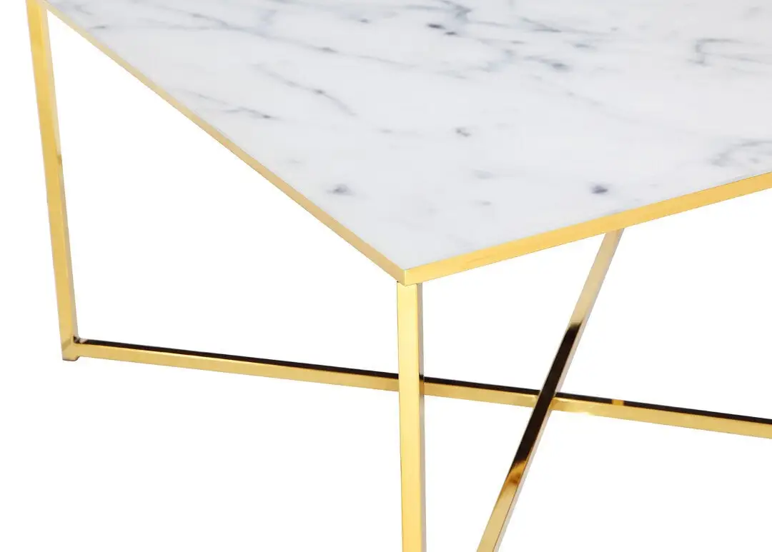 Sohvapöydän jalat ovat kullanväristä metallia. Pöytälevy on lasia, lasin alla on marmorijäljitelmä muovia.