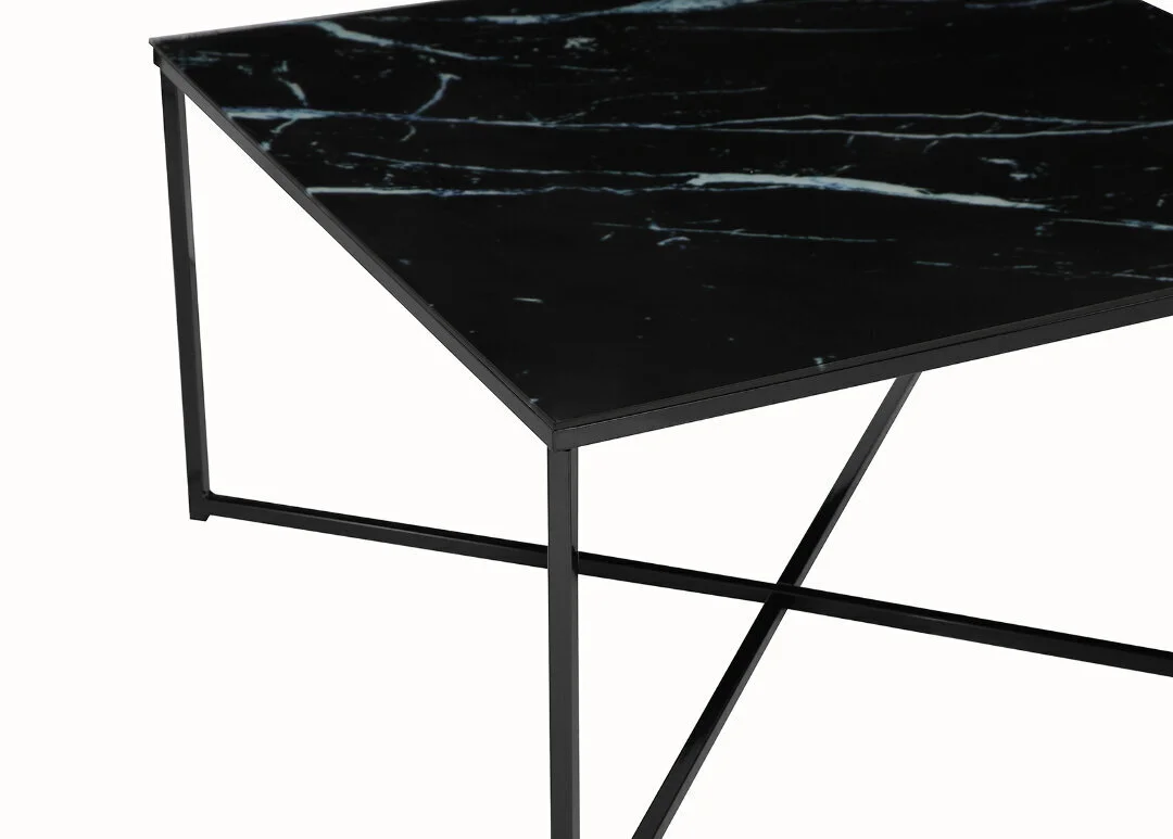 Sohvapöydän jalat ovat mustat metallia. Pöytälevy on lasia, lasin alla on marmorijäljitelmä muovia.