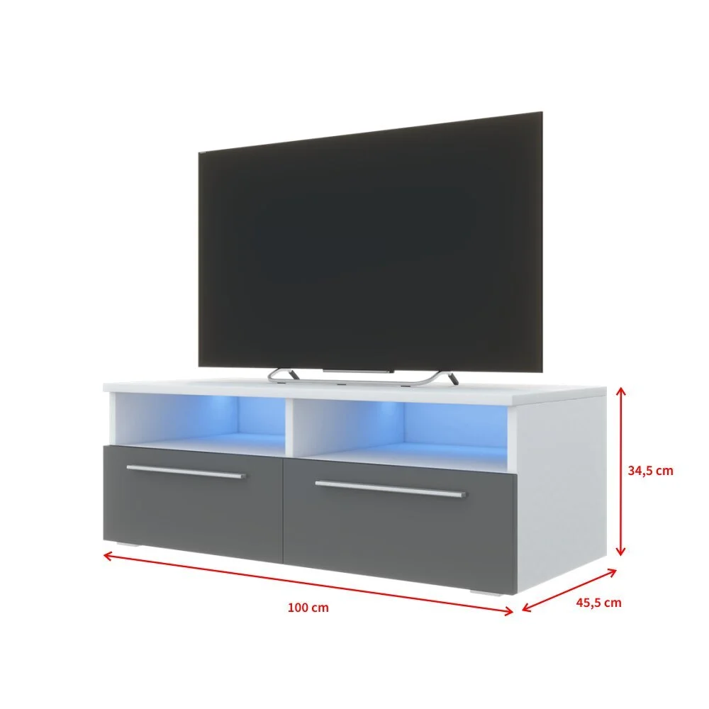 TV-taso, jossa on kaksi ovea ja lasihylly LED-valaistuksella.
