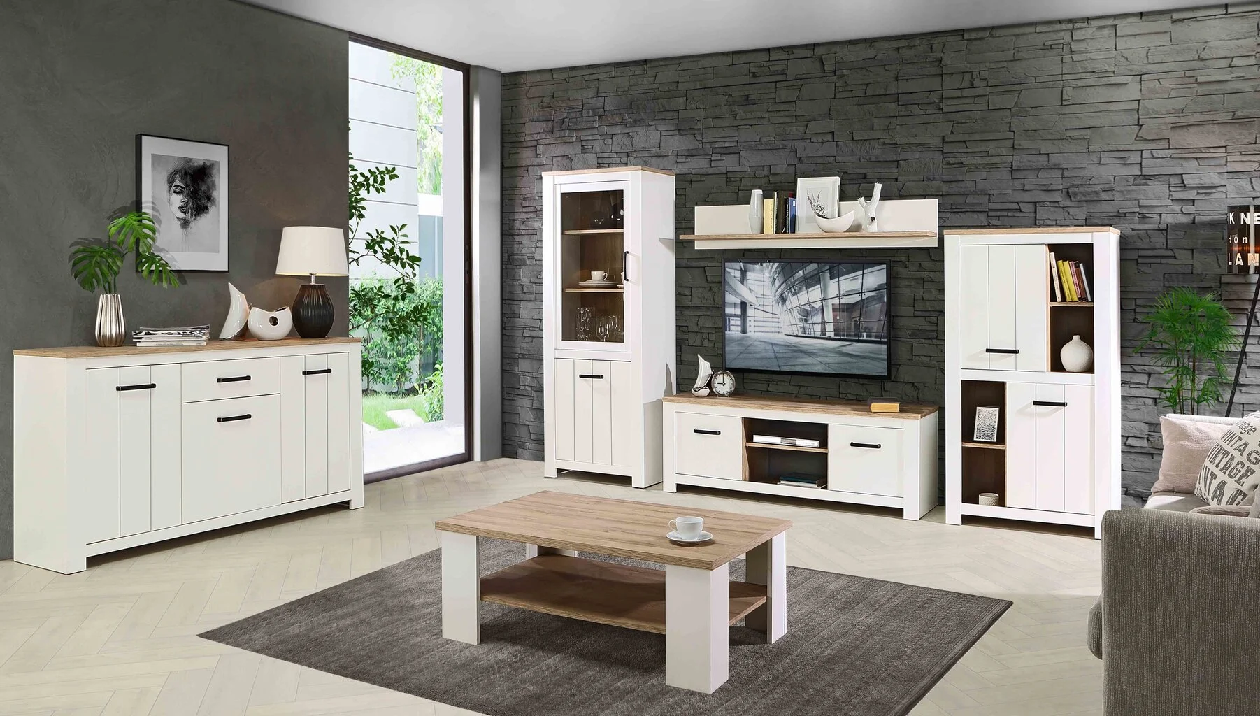 - Setti sisältää:vitriinin, kaapin, seinähyllyn, TV-pöydän.
