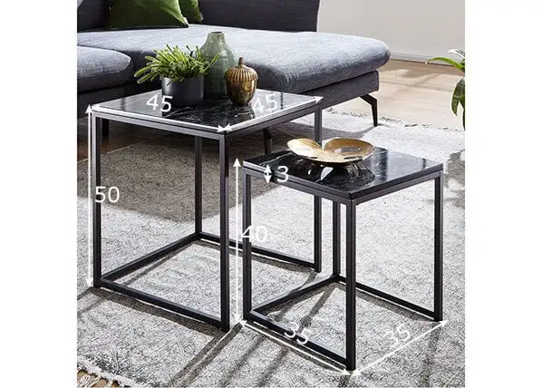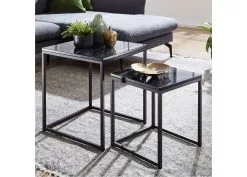 Tyylikkäät apupöydät. Toimitus sisältää kaksi apupöytää. Pöydät ovat neutraalein sävyin ja sopivat jokaiseen olohuoneeseen. Pöytälevy on PVC-pinnoitettua MDF-kalustelevyä. Runko on mustaksi viimeisteltyä tukevaa metallia. Jaloissa on muovikorkit estämään lattian naarmuuntumista.