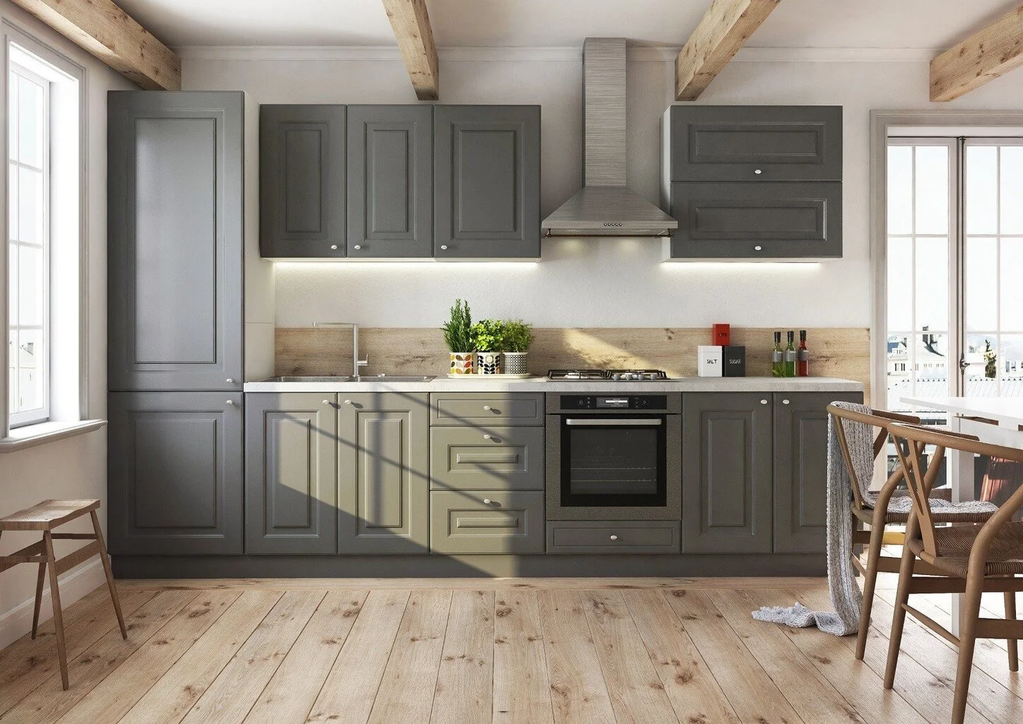 Bella-keittiökaapit ovat loistava valinta klassisten keittiöiden ystäville. Tämän malliston ulkopinnat on koristeltu syväjyrsinnällä, joka täydentää täydellisesti perinteisiä sisustuselementtejä: puulattiat, vaaleat seinät, koristeelliset viimeistelymateriaalit. Bella -kalusteet on valmistettu vahvasta MDF-levystä, joka on jyrsitty ja päällystetty laadukkaalla kalvolla.