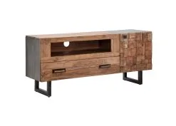 Teollisuustyylinen akaasiapuinen TV-pöytä Metalliset vetimet ja mustat jalat Yksi ovi ja kaksi laatikkoa Oven takana on yksi hylly. Laatikko liikkuu ilman kiskoja.