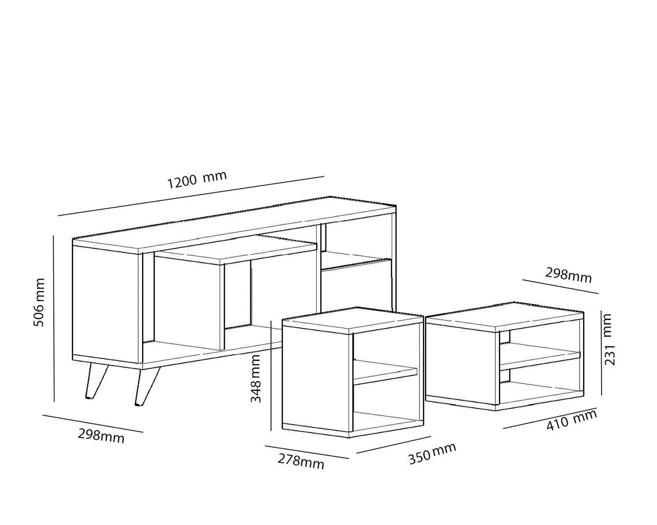 - TV-pöydän mitat: pituus – 120 cm, korkeus – 50,6 cm, syvyys – 29,8 cm;