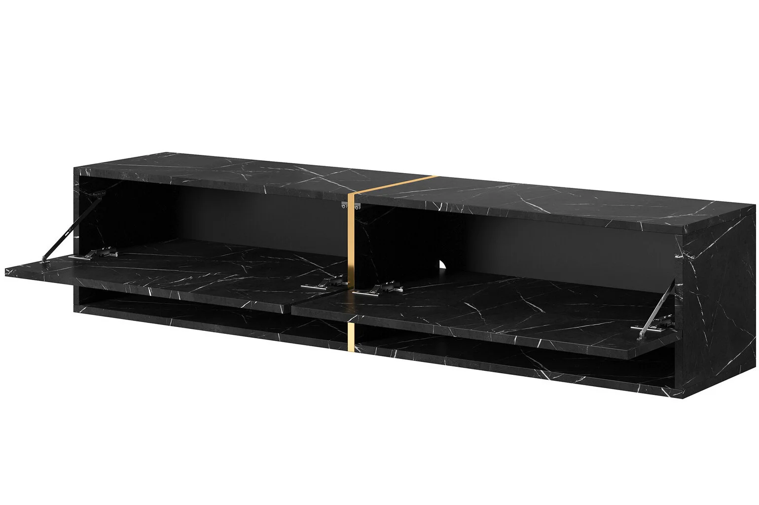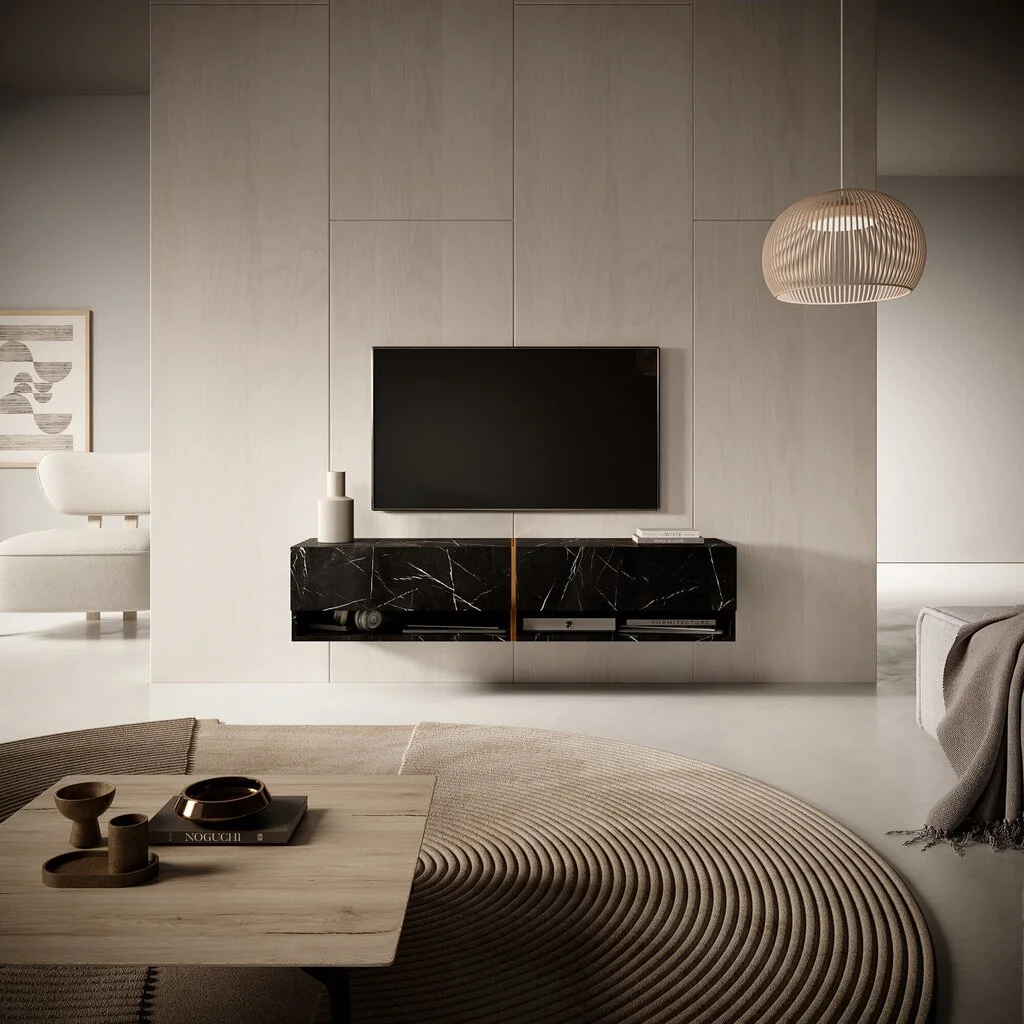 Mirrgo-televisiokaapille on ominaista sen yksinkertainen muoto, jota on rikastettu marmoria jäljittelevällä modernilla värillä. Keskellä olevan kultaisen pystysuoran insertin ansiosta kaikki näyttää erittäin tyylikkäältä, ja siitä voi tulla huoneen tunnusmerkki. Huonekalujen etuna on säilytystila; kahdessa lukittavassa kaapissa voi onnistuneesti piilottaa kaikki konsolipelit, ylimääräiset kaapelit tai muut pienet tavarat, joille ei yleensä ole tilaa. Alareunan kaksi avointa hyllyä ovat täydellinen paikka digisovittimelle, konsolille tai lukemallesi kirjalle.