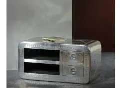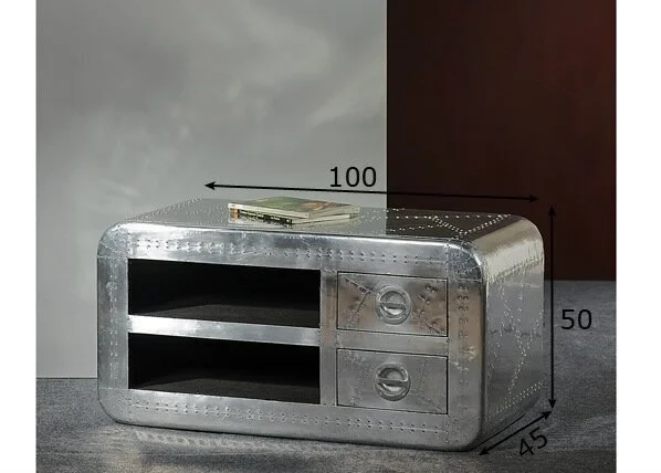 Ilmailusta inspiroitu tv-taso. Valmistettu käsityönä mangopuusta (runko) ja MDF-levystä (laatikot). Viimeistelty alumiinikerroksella. Viimeistelty dekoratiiviruuveilla. Tv-tasossa on kaksi laatikkoa ja kaksi avohyllyä.