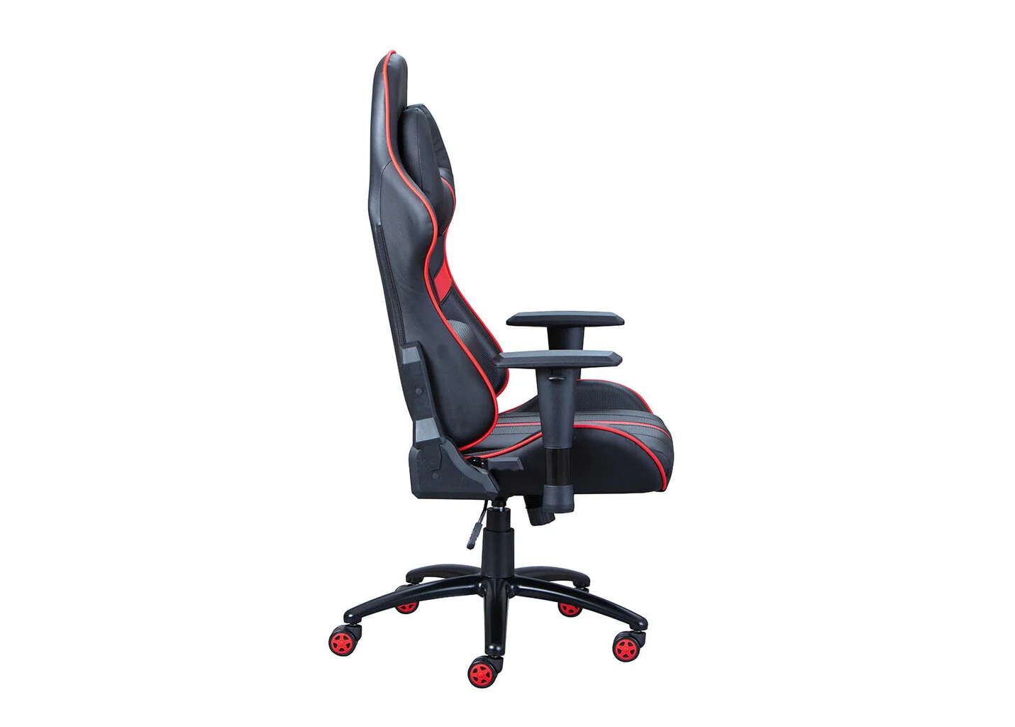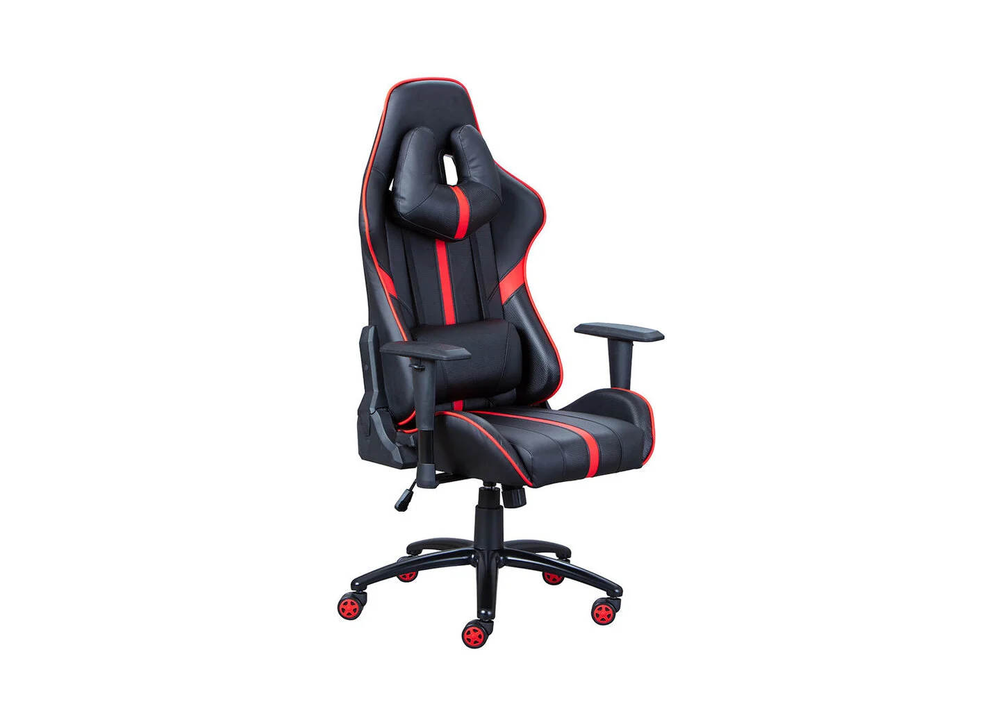 Musta ja punainen työtuoli, joka on valmistettu keinonahasta. Pehmustettu. Selkänojan sivuilla oleva lisäpehmuste takaa mukavan istuma-asennon. Pakkaus sisältää myös 2 tyynyä. Tuolin korkeus ja selkänoja ovat säädettävissä. Tuolin käsinojien korkeus on säädettävissä. 5 pyörää, joiden ansiosta tuolia on kätevä liikutella.