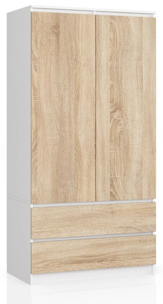 Levyn yläkerros peitetään usein erityisellä kalvolla, joka varmistaa huonekalun lujuuden. Viimeisimpien tuotantoteknologioiden avulla nämä laatat voivat olla kosteudenkestäviä, minkä vuoksi nämä materiaalit eroavat monipuolisuudestaan ja sopivat mihin tahansa huoneeseen. Vaatekaappi NORE S90, valkoinen / tammi. löytää varmasti paikan kodistasi!