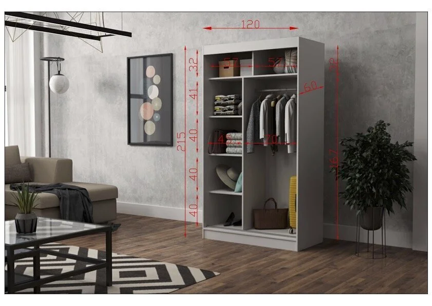 - —Kaapin mitat leveys 120 cm, syvyys 60 cm, korkeus 215 cm;