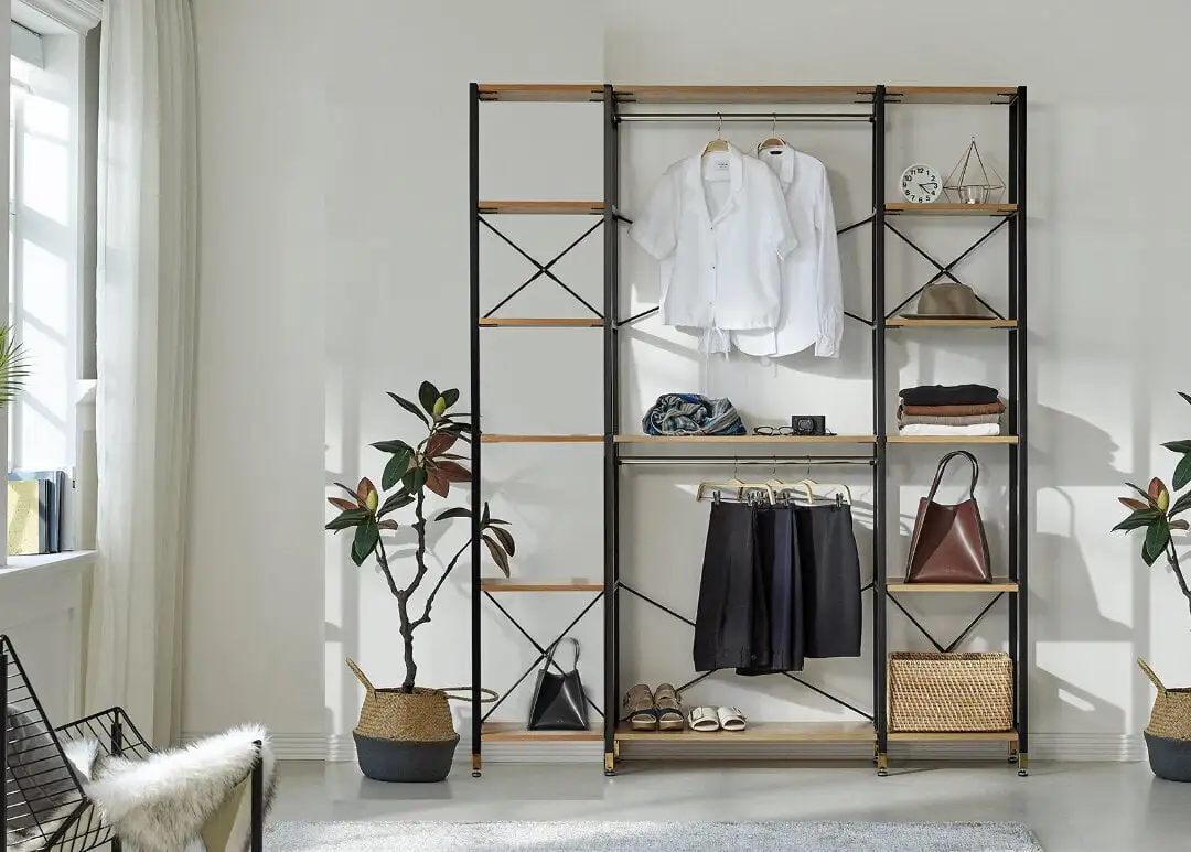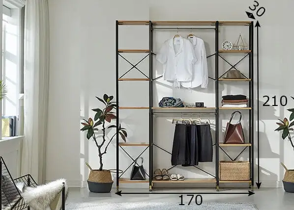 Keskellä on 2 vaatetankoa ja 1 hylly