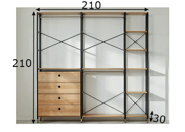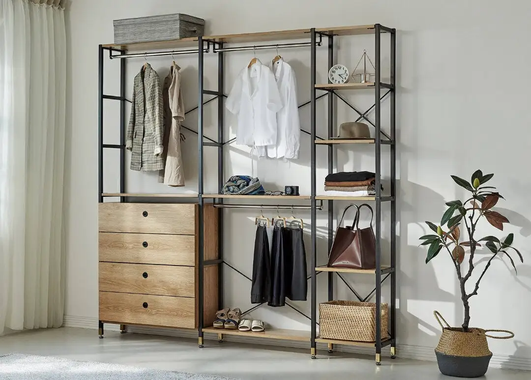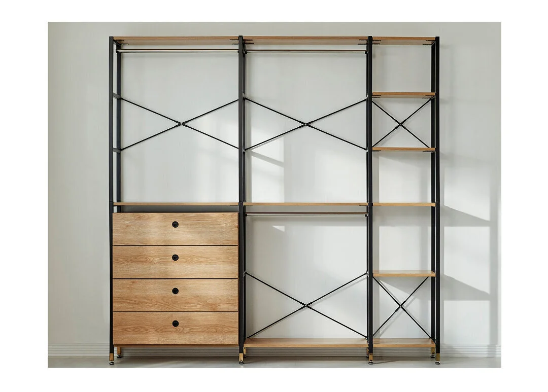 Vasemmalla 1 vaatetanko, 1 hylly ja 4 laatikkoa metallisilla liukukiskoilla